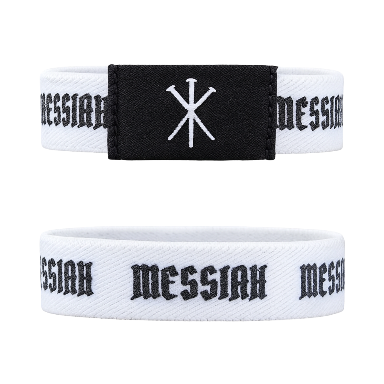 Messiah wristband. The classic black and white design features the 3 nails design against a clean white band with contrasting Messiah black text. This comfortable cuff style bracelet has meaningful symbolism. Perfect for everyday wear. The durable elastic material ensures a secure yet flexible fit on most wrist sizes. The minimalist aesthetic allows this wristband to complement any outfit while serving as a meaningful reminder of your beliefs.